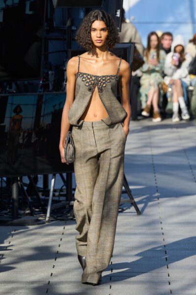 Jeżeli lubisz stylizacje w jasnych kolorach, koniecznie kup na jesień spodnie w odcieniu różowym. Aby zilustrować ci dlaczego, spójrz na zdjęcie poniżej. Jak się okazuje na pokazie Stelli McCartney pojawiły się w duecie dwurzędowej marynarki z szerokimi ramionami. Niewątpliwie taki garnitur to strzał w dziesiątkę dla każdej bizneswomen. Można nosić go z butami na obcasie lub sneakersami.