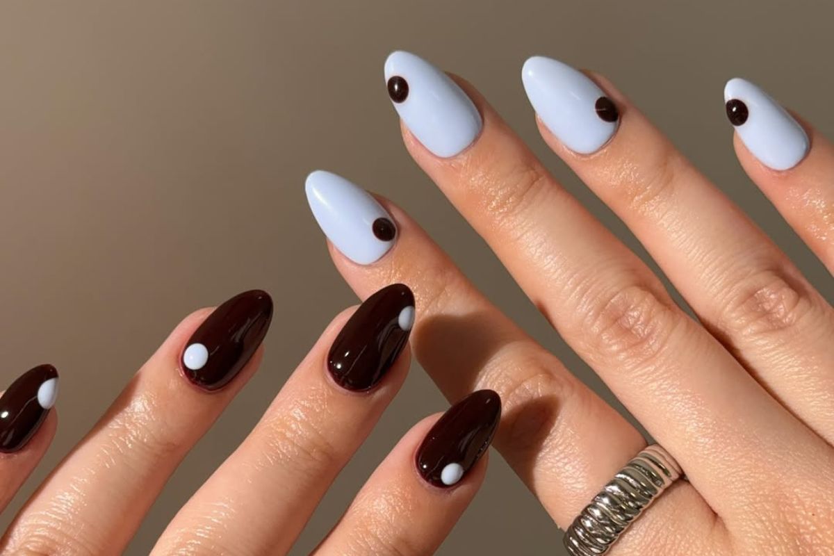 Niebiesko-brązowe paznokcie w tej odsłonie często przypominają małe graficzne kompozycje. Turkusowe linie na tle espresso, błękitne kropki na ciepłym brązie czy wyraźny color blocking nadają stylizacji artystycznego charakteru, ale bez przesady.